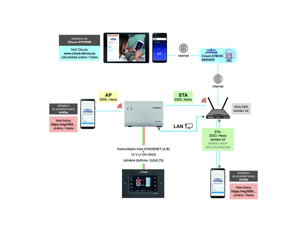 - pripojenie k počítačovej sieti cez Ethernet alebo WiFi a umožňuje správu zariadení cez internet na Cloude ATMOS